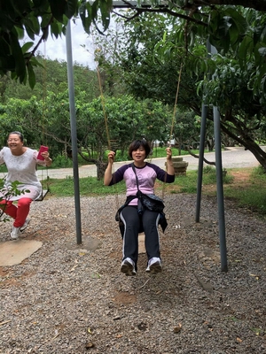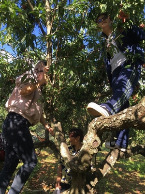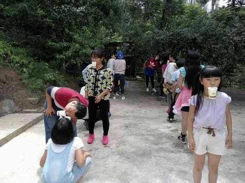 飯后的休息時間是大家最喜歡的階段,每位學(xué)員都各顯神通,找自己喜歡的娛樂項(xiàng)目放松,滿山的林子里,到處都是我們的身影。童心未眠而且速度快的自然飛奔到大人小孩都喜歡的兒童游樂場地去蕩秋千、玩蹺蹺板、玩雙杠、打水槍……嘴饞的跑去后山上,選擇自己中意的果樹,要么上樹摘果子,各種奇葩的姿勢,要么在地上直接伸手摘了送到自己嘴里,滿滿的都是汁兒。文靜一點(diǎn)兒的就到處游山逛風(fēng)景,領(lǐng)略下涼風(fēng)撲面而來的神感。